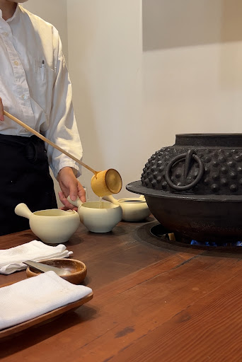 開店直後に入店し茶葉を見ていたところ、後から来た外国人の家族(夫婦+ベビーカーの赤ちゃん)がテイクアウトのドリンクを注文し、確認もせずに店内のカウンター席に座って飲み始めました。 茶釜がある場所だったので『そこでテイクアウトドリンクを飲んでもいいのかな?予約した人限定の試飲用の場所じゃないのかな?』と思いましたが、年上の店員さんが注意もせず、むしろ英語でニコニコと歓迎していたため、『ここで飲めるのか』と判断して、私も後でドリンクをオーダーしようと思いました。