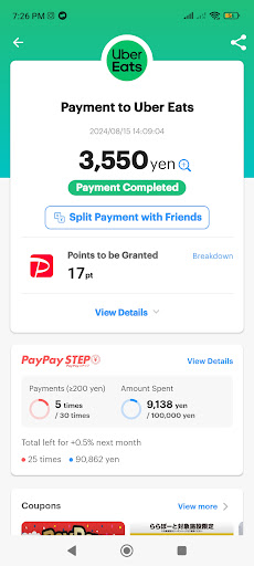 I ordered 2 boxes of Pizza by Uber eats, at first it was fine until I charged again after I paid earlier.. at first, it cost 3050¥ PayPay Credits and 500¥ Uber Credits