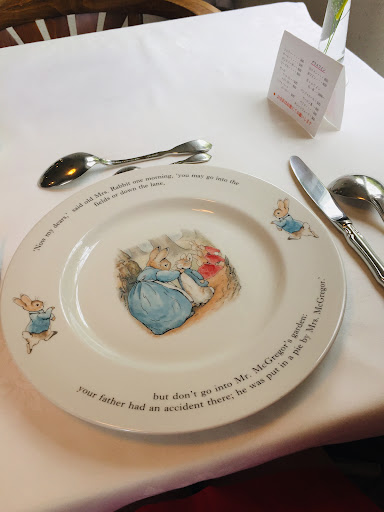 かわいいお店。床の出っぱり?に注意してねーと言われつつ、奥のテーブルに案内されると、ピーターラビットのお皿が出迎えてくれました。