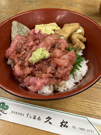 店舗専用の駐車場はなく、店内はテーブル席が並ぶ昔ながらの雰囲気。 終始客は私のみだったが、居心地は意外に良くのんびり過ごせた。 軒先に本日のオススメは漬け丼との張り紙が目に入り、立ち寄ってみた。 5分程で提供されたが見るからに漬けではないし、お揚げや玉子焼きが盛られた変わった丼。 鮪はまさかの中落ちで、漬け用のタレがかけられているから漬け丼なのかな。 しかしこの中落ちは脂がのって味も濃く、しかも鮮度もなかなかと感じる美味しさ。 甘めに煮込んだお揚げや玉子焼きも、脇役として良い。 ただ、酢飯は酢が強めであまり好みの感じではなかったのは残念。 味噌汁が付き、900円はお値打ちだった...