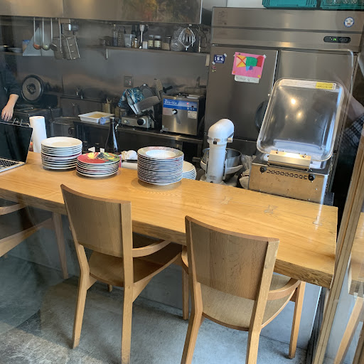 手前にオープンキッチンとカウンター。 奥に大きな机が2つあって、先客の方とある意味相席?のような形で着席。間が広いのであまり気にならないと思います。