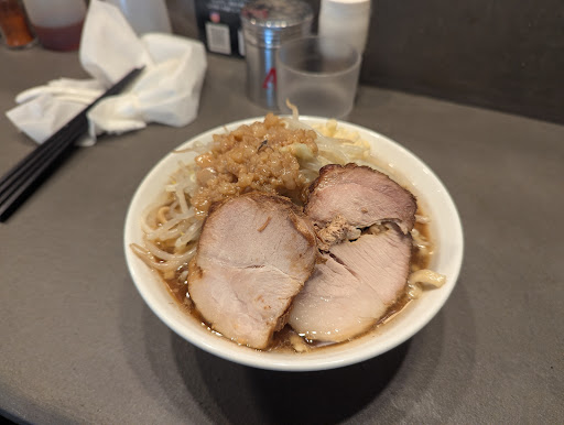 【追記】2回目のランチにお邪魔。今回は前回より味がしっかりしている印象でおいしくいただけました。なので★を1つ追加しました。 【追記】3回目のランチ。初の「汁無し」をオーダー。汁無しでもニンニクコールを聞かれます。汁無しの方が麺とアブラの旨みをダイレクトに感じられて商品の完成度が高いです。ラーメンだと250がちょうどいいですが、汁無しだと300で大丈夫でした。 【追記】6回目のランチ。気に入って食べていた汁無しですが、味が薄く、旨味も薄い。追加料金で野菜をマシマシにしても、二郎のマシ以下。★を戻しました。