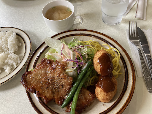 ランチメニューをいろいろ見ていましたが、日替わりランチのポークステーキとクリームコロッケが美味しそうだったのでそれにしました。 結果的に大当たりだったと思います! ポークステーキは味付けが素晴らしく、ライスも美味しい。大好きなクリームコロッケも、粉っぽさがなくてとても美味でした。