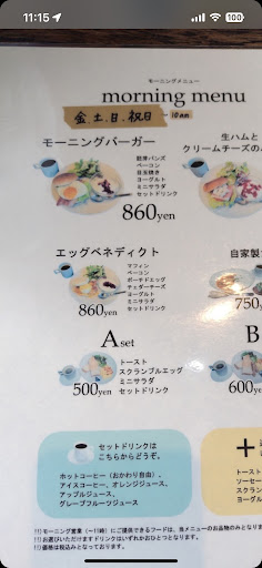 We looked online and found that on weekends and public holidays, breakfast is served from 10:00 am (see photo below). We arrived at 10:03 on a public holiday and were told breakfast ends at 10:00 am. There was no effort on the part of the staff to accommodate us. So we switched to the lunch menu. For 1600 yen you get a burger with fries or onion rings. That would be okay as the quality of the small patty and the buns is good. However they served lettuce that is normally thrown away (the centre of the lettuce head). Of course it looks nothing like the photos of the burgers in the menu.
