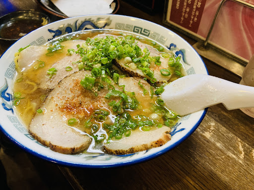 Read more博多にんにく(ラーメン)¥890(税別)。 博多ラーメンを称する割には明太子も辛子高菜も木耳もメンマも紅生姜も海苔も煮卵も何も入ってない。テーブルにも置いてない。殆ど愛想が無いラーメンである。愛想と言えば辛うじて薄い叉焼が乗っているくらいである。麺も博多ラーメンを称する割に替え玉向きの細麺ではなく中細縮れ麺である。博多ラーメンの割に麺はバリカタではない。しかしこの適度に湯がかれた中細ストレート麺が、ニンニクたっぷりの濃厚豚骨スープとよく絡んで抜群の旨さを発揮している。異論はあるが、旨過ぎるので黙って食うしかない。腹一杯でも高血圧でも通風でもスープを飲み干すまで帰れないという急性の中毒症状に陥る危険性が高い。だが近所に天下の日赤病院もあるので大船に乗ったつもりで堪能してみても良いかも知れない。 結論、これは博多ラーメンではなく庄原豚骨ラーメン、若しくは風龍豚...