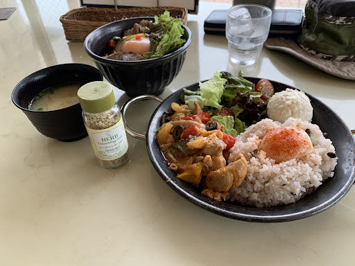 注文したのは、オリーブ豚丼とチリンドロンライス。 オリーブ豚丼は温玉が上に乗ってたり、少しのサラダも上に乗っていて、美味しかったです。焼き豚卵飯みたいな感じに最後はいただきました! チリンドロンライスは、初めて食べたものでしたが、野菜と鶏肉をトマトソースで煮込んだものをライスで、いただくものみたいで、プレートに乗ってやってきました。乗っているサラダには、EXオリーブオイルがかけてあり、それで楽しませてもらいました。鶏肉のトマトソース煮込みは、オリーブの味がしっかりと、ソースや鶏肉に絡んでおり最初から最後までほっぺが落ちそうでした。初めてでしたが、本当に美味しくいただきました。チリンドロンライスは、その日数食の限定メニュ...