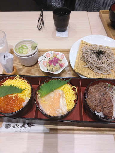 注文はタブレットで。 水はテーブルに備え付けの水差しがあるので セルフで飲み放題。 備え付けの調味料は醤油のみ。 それと小さなパックされたお手吹きが数個。 爪楊枝と七味くらいは欲しいかな。 配膳はロボットかスタッフ。 ロボットだと自分でテーブルに降ろさなくてはならなくテーブル席の奥に座っていると取りづらい。 北海道食べ比べセット3種を注文。 蕎麦のつゆの上の小皿にわさびとネギが少量載ってたけど、丼ぶり物と共用して使うみたい。