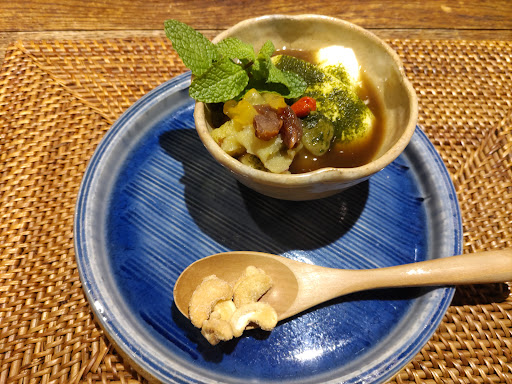 うにクリーム美味しかったです。 ソース残さないように、ココナッツパンで最後までお皿をきれいにぬぐって食べました。このココナッツパンも美味しい。 おかず盛りの新鮮な野菜のサラダも、味の染みた大根と人参も美味しかった。 杏仁豆腐は、さつまいもが乗ってたり、蜜に緑茶もかかっているという個性的で美味しいものでした。 入荷した蜂蜜が美味しかったから作ったと、カシューナッツに蜂蜜をまとわせた物を出してくれて、香りも良くて美味しかったです。