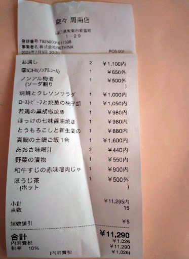急遽、当日にネット予約したので、単品を注文。 お通しはどれもおいしく大満足。これで一人550円は安いです。 どれもこれも美味しかったのですが、特にローストビーフは、肉厚で食べ応えもあるし味付けもよかった。 焼鯖とクレソンのサラダも新しい味で美味しかった。サラダに一緒に入ってた生の水ナスを初めて食べておいしくて感動しました。 ただ、なぜか私たちがいるところだけ仕切りの暖簾が揺れるくらいの冷房が効いていまして、寒くて寒くて(泣) 時間かかるだろうとおもい、早い時間に土鍋ご飯と若鶏とほっけと、とうもろこしの天ぷらを同時に頼んだのですが、ほっけと若鶏は、少し待ったけど、まだ早目に出て、ご飯は1時間くらいで来ましたが、天ぷらは待てど暮らせども来ず、身体が冷えてきて、早く帰りたくなったので、店員さん呼んで催促しました。 寒くなかったら、催促せず待ってるタイプなんですが、寒すぎて催促させていたどきました。お忙しい中対応していただきありがとうごさいました。 で、急がそたせいで、最後に頼んでいた和牛すじの赤味噌肉じゃがに、じゃがいもが入っておらず、ちょっとびっくりしましたが、もうこれ以上時間とお手数おかけしてもとおもい、牛すじのみおいしくいただきました。 料理はとても美味しいので、できれば冷房の効きぐわいにも配...