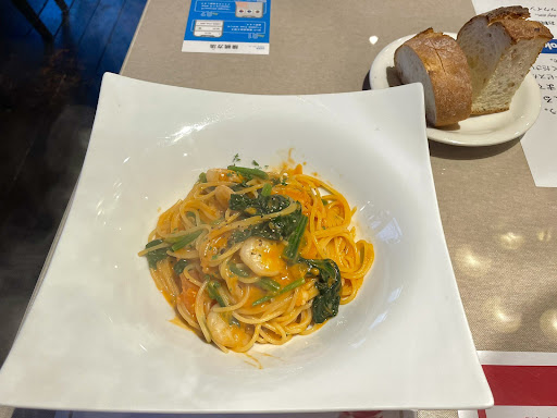 エビとホウレン草のトマトクリームパスタ ¥1078 パン・ミニサラダセット ¥440 カスタードプリン ¥440 ホットティ ¥418