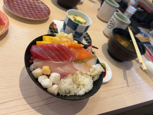 海鮮丼。 こっちは ネタは8種ほど。 写真はネタを動かしてるのでハゲてますが、 実際はネタで覆われてました。 特筆するネタは特になし。 普通のまぐろ2、 普通の白身各1(一応炙りになっていた) 寿司エビ1 卵焼き サーモン1 イタヤガイ6こ イカソーメンガリくらい。 ↑下から美味しかった順になってます。 言ったら白身以外地物ではない。 原価300円程度。 食べ方に問題があるのかネタが少ないのか、はたまたしゃりが多いのか。 最後はしゃりが余りました。