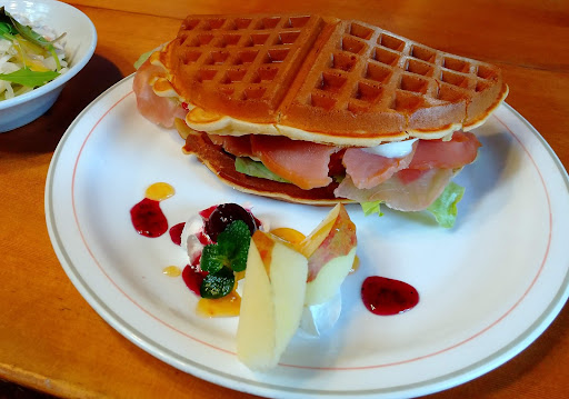 大判ワッフルの甘いのと、生ハム、スモークサーモン、クリームチーズ、トマト、レタス、ピクルスにドレッシングの塩辛いのが合わさった禁断の味~!?なのに意外とマッチ?して美味しい~!プレートにはフルーツとホイップクリームも添えられています。 これに、サラダと香りの高い厳選豆のコーヒーまで付いちゃう!なんと最後にコーヒーゼリーまで。コスパ最高~! おすすめです!