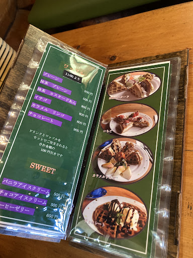 Read moreたまたま、こちらのお店を見つけて美味しそう!と、思い来てみました。 ログハウスで、天井が高く心地よいです。 抹茶カスタードあんとアイスコーヒーワッフルサンドはセットでサラダとドリンクつき。