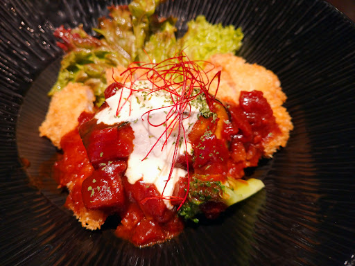 酸味の効いたトマトソース、深みが有り鶏肉の旨味をしっかり引き出しています。クリームコロッケもボリュームあるサイズ、揚げたてホクホクで白ご飯が進みます。茄子・さつまいも・南瓜・オクラ・ブロッコリーの野菜もしっかり、とても美味しい洋食ランチに満足です。