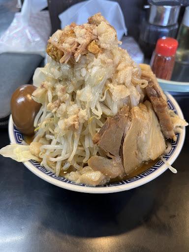 Read moreお目当てであった鷹の眼が非常に混んでいて断念。次の候補であったこちらへ初めての訪問です。 鷹の眼と雅狼ともに二郎系ではありますが、見た目からしてだいぶ違いそう。 まず、鷹の眼より雅狼が優れている点、場所がわかりやすいことと駐車場があること。 車移動の身としてはロードサイド店で駐車場有りの店舗は非常に助かる。 それと営業時間、鷹の眼は22時までだが雅狼は26時まで。 ここまではラーメンに対しての評価ではないですね。 ではラーメンですが塩の大盛りを頼みました。 初めての店舗ではあるのですが塩が好きなのであればやっぱそっちになってしまう。。が、これ失敗でした。 普通のラーメンがどうかはわかりませんが、塩は美味しくはない。味の輪郭がないというかなんというか少なくともまた食べたい味ではなかった。 野菜はクタクタな物。麺は極太とありましたが中太くらい。 しかし麺はなかなか美味しいかも。 こちらは最初からニンニク乗ってるのが普通だそう。 ニンニク抜きたい場合は最初のコール時に無しでと伝えない限りは乗ってきます。 このニンニクが醤油に漬けてありなかなか美味しい。 そして塩のスープがイマイチだったため、早めにニンニクを溶かしてスープを飲むと。。 いやしょっぱいな。 二郎系好きな人はしょっぱいの好きな人が多いのでこれはこれでいいのでしょうけど、私はしょっぱくて嫌でした。 トータルして味には満足できませんでした。 また、コスパが悪くて塩の大盛りだと1000円超えます。 野菜(もやし)を増すのにも120円かかりますし、麺の増量もその都度お金がかかるようで麺量1kgともなると+1200円だそう。 普通のラーメンが860円?とかで+1200円だと2000円超えちゃいますね。 私はそんな量食べないので関係ないのですが、他の二郎系のように+100円や200円で対応してくれても良さそうなものなのにと感じました。 ここまでネガティブなことばかり書いてますが、プラスな点としてメニューの豊富さがあります。 ラーメンの他、塩、味噌、担々麺、それにまぜそば、つけ麺とあったかな。 他のを試してみたら評価は上向くかもしれません。 ただこの一回だけ食べた現状としては評価は☆2つ、次回以降また機会があれば営業時間も長いので寄ってみたいと思います。 その時のために期待を込めて...