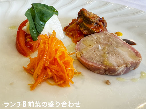 ランチBセットを注文 前菜の盛り合わせは美味しいのだけど、お皿の上に配置された前菜が片方に偏って配置されててなんかバランスは微妙😅