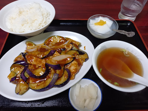 なす味噌炒め定食を注文します。 油通ししてあるのでなすは柔らかくて熱々で甘めの味噌の味付けは私好みです。 具材は、なす、豚肉、玉ねぎのみです。 大根の漬け物、醤油味スープ、ライス、美味しくない杏仁豆腐もどきが付いています。 メニューが豊富なので違う...