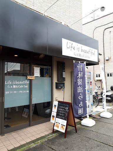 Read more2019年8月8日にオープンした新店Life is beautiful らぁ麺&café barに来てみた。 お店があるのは、草加金明通り沿い。 草加バイパス 清門町北交差点から草加金明通りに入って直ぐの場所。 お隣はCoCo壱番屋 草加セーモンプラザ店。 以前 居酒屋だるまや→ 居酒屋でんだった跡地。 お店に入るとほぼ満席。 丁度カウンター席が2席だけ空いていた。 客層は家族連れからサラリーマンまで幅広い。 店主はケツメイシの大ファンで、店内にはケツメイシ関係のグッズ等が飾ってある。 屋号もケツメイシの曲名から。 店内BGMも言わずもがな。(笑) ランチタイムはラーメン専門店だが、ディナータイムはカフェバーとしての営業。 内装も洒落ている。 券売機は無くて、口頭で注文するスタイル。 注文すると、先にミニサラダが提供させる。 サラダはドレッシングが " 和風 " 、" フレンチ " 、" 胡麻 " 、" マヨネーズ " の中から選べる。 私は " 胡麻 " 、主人は " フレンチ " を選択。 カウンターに " 綾鷹 " 、" 麦茶 " のペットボトルが置いてあり、お冷やの代わりに自由に飲む事が出来るのも変わっている。