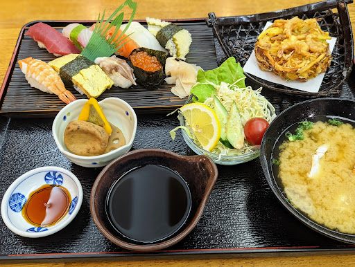 お寿司とかき揚げが目を引く品数豊富な膳が配膳。 マグロ、エビ、イカ、サーモンなどなどの定番ネタ🍣 鮮度が高く抵抗なくスッと入る歯切れの良さ👍 食べながら考えていました、お寿司のおかわりを🤔 十数分後に現実となりました、それは後述します。 かき揚げはしっかり揚げられて油切れもバッチリ👌 サクサクを超えたザクザク食感😋 香ばしさがたまりませんな(*´🐽`)