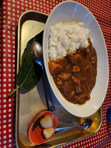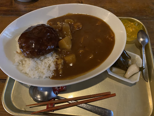 煮込みハンバーグ、 スパイシーな、つきカレーがお勧めと 聞いていたのですが、 両方食べたかったので、 ハンバーグがトッピングされている よくバークカレーをいただきました。 スパイスの効いたカレーは辛過ぎず 好きな味付けでした。 自家製のラッキョウはピリ辛で食欲を増進します。