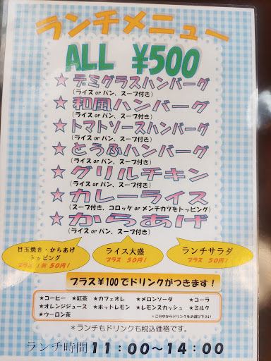 Read moreこじんまりとした洋食屋さん。 ご夫婦の掛け合いも楽しい感じで、静かな店内。 シンプルな店内で、ランチを頂きました。 ランチは、オール500円。11:00~14:00 ハンバーグが3種類のソース(デミ、和風、トマト)の他に、豆腐ハンバーグやカレーや唐揚げ定食等。 今回は、トマトソースハンバーグに。 アツアツの湯気が勢いよくあがるハンバーグは、柔らかくてアツアツ、トマトソースも玉ねぎが大きめのみじん切りが入って、たっぷり楽しめ、スープとライスがついて、500円。めちゃくちゃお得で満足感がすごいランチでした +50円で、目玉焼き、唐揚げ1個、サラダがつけられるので、ちょっと足りない人にも良いかなって。 目玉焼き付けたかったけど、トマトソースにしたので、今回は、無し。 ドリンクも、+100円でつけれますよ。 男性には、サービスで、ご飯多めにしてくれてました お近くに行った時は、立ち寄ってみてください。 席数が少ないので、待つことも? 駐車場は、あります。店の前に4台、お店の方に言えば、隣のスペースにも止められるかも?