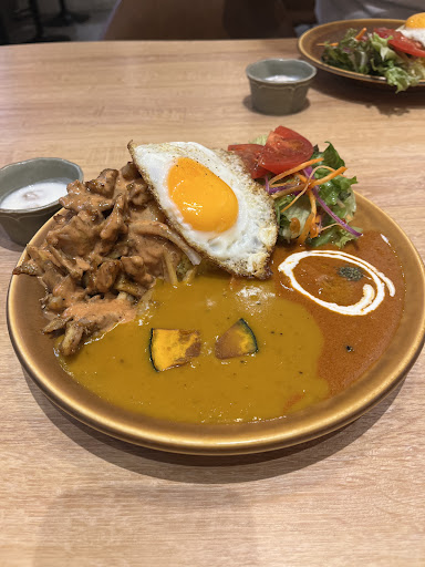 ■カレーについて カレーの種類は複数あり、オーソドックスなキーマカレーやチキンカレーを主に数点のバリエーションがあります。セットは基本的に1つカレーが選べるようになってますが、100円追加することで複数のカレーの食べ比べが楽しめます。