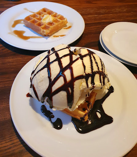 他のお客さんが食べてるのを見てうらやましくなり、デザートにワッフルを注文! 正直ワッフルは飾りで、アイスがメインです。抹茶とキャラメルをいただきましたが、どちらもアイスはスーパーカップ一つ分くらいはありそうで、アイスの箸休めにワッフルを齧る感じになりました。なのでアイス美味しかったなぁという感想になりますが、市内なら絶対に有り得ない価格なので満足度は高いです。