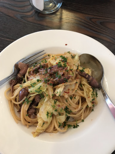開店と同時に入店して ランチセットと、夜のメニューから生海苔の牡蠣クリームパスタをチョイス A豚バラと春キャベツのアンチョビレモンパスタ +1300円で黒毛和牛ランプを追加して