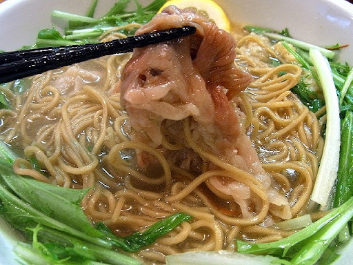何故に麺とスープが別々に出てくるのかといえば、このビジュアルを見せたいからでしょうね。 松阪牛の赤、水菜の緑、レモンの黄、彩り鮮やかですよね。 松阪牛の赤みがインパクトありますよね。 先にスープが入れられていると、この赤みが見れませんもんね。