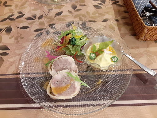 Read moreディナー4180円(税込)のコースを頂きました。 前菜にマリネとトウモロコシのプリン スープは大根のスープ 温かいパン 魚料理は白身魚のポワレと手長エビのソテー 肉料理は和牛のヒレステーキにマッシュポテトとほほ肉 デザートは三種のケーキとフルーツ といったコース内容でおそらく日替わりです。