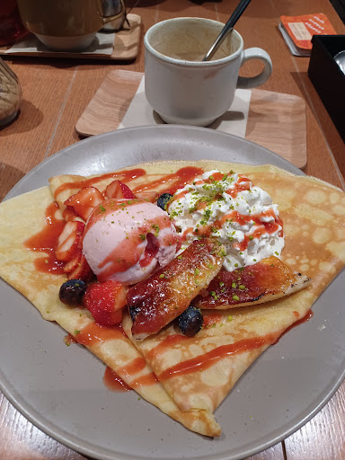 いちごのクレープが美味しそうだったので、イチゴ&クリームチーズ 1,580円をオーダーしました。ツレは、イチゴ&バナナキャラメリゼのクレープ1,780円を。ふ クレープ自体は、美味しく頂いたのですが、肝心のイチゴが少ない…。商品写真にこだわるのは、良くないかもしれないが、配膳された際、“私、何頼んだっけ??”となり、また提供ミスかテンション下がりました。期待していたものと違うと悲しい。ツレのクレープもしかり。でも、バナナのキャラメリゼが美味しい!と喜んでいたので、水は差さず...