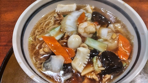 Read more月曜日のオープン30分後にお邪魔しましたがお客さんいっぱい。並ばず座れましたがどんどんお客さん来るけど御年配の方が多い。ベニマルとかあるので買い物ついでに寄るのかな?ここは10年振り位です。メニュー豊富ですが醤油ラーメンは煮干しです。名物のうま煮ラーメンとこちらもイチオシだったチャーハン(半)三宝亭餃子、ラーメンとうま煮飯?のセットおつまみメンマネギ?生ビールを注文。昔食べた時煮干しラーメン無理思ってたから遠ざかってましたがスープ飲んだら( ᐕ)アレェ?あっさり。煮干しもそこまで強くなくスープ美味しかった。うま煮ラーメンとうま煮飯は同じ餡でしたが醤油が濃すぎてあたしは('へ')...