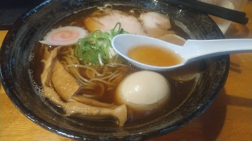 派手な感じの店舗外観から勝手にとんこつ系のラーメン屋さんと思い込んでいましたが、ここは魚介類系の出汁をメインとしたラーメンを作っていらっしゃるんですね。 私は今回は定番の醤油ラーメンに半熟卵トッピング&ライスを注文。