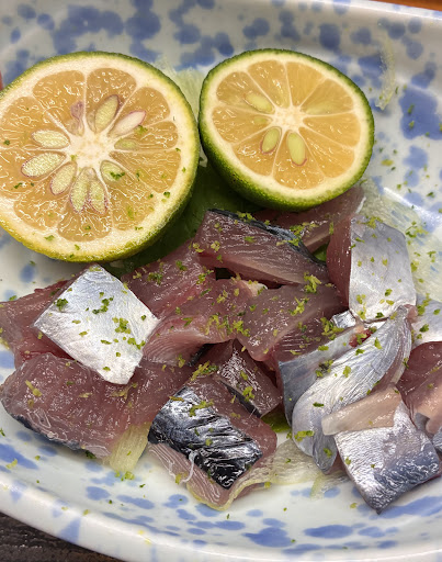 席に着くとすぐに新子の定食が出てきました。 皮の付いた新子がぶつ切りになって出てきます。新子にぶしゅかんの皮がかかっており、ここに実を絞って仏手柑の果汁で頂きます。ちょっと醤油に漬けるのもいいです。