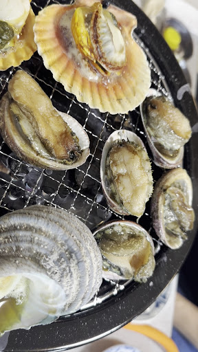 My second time being here at this restaurant, it is definitely worth coming to more than once. They’ve got a large assortment of seafood from clams, scallops, snails, abalone, shrimp and much more. You live cook the food, so it’s an intense experience but it makes you really appreciate the meal. They are super friendly and help with the cooking if you’re not entirely sure what to do! (The first time I went I was a bit shocked, but they took good care of their guests!) they serve sets of different seafood options and also have pre-cooked options available. Very fun with a group of friends so I’d recommend coming with a group of you can. Prices range upwards of 3000yen, but definitely worth the price and experience. Located in a beautiful floating bay with a view of mountains...