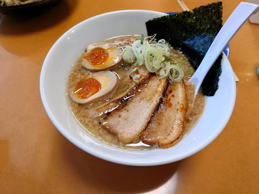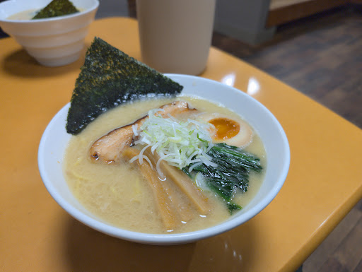 12時過ぎに入店、席は半分くらい埋まっていた。醤油豚骨ラーメンの感想を以下に。 まず低評価内容から。一つは値段がやや高いこと。これなら850円がせいぜいかと思った。もう一つはチャーシューがペラペラなこと。厚さが2㍉もなく一枚というのが実に残念。 ではラーメンの評価に。まず麺だか、良くも悪くも普通の中太麺。個人的には少しコシが欲しいくらい。具は一口大のキャベツ10枚位、ほうれん草、チャーシュー1枚、海苔1枚。炙りチャーシュー。どれもコレといって特徴的なことはない。そしてスープだが、醤油豚骨として完成度が高い。口当たりがあっさりしていて豚骨が前に出過ぎる事なく、旨味の乗った醤油味にさえ感じられる。しっかりした味だが、飽きがこないバランスだった。 以上から、味だけなら星4だが前述のマイナスが残ってしまうのが本当に残念。でも、また行ってもいいか...