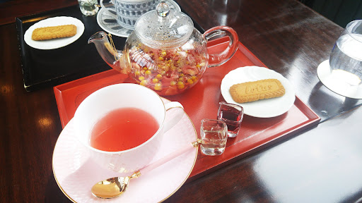 ただ、 先日2回目に訪れたところ、青色のハーブティーを頼んでワクワクしていたのですが、席まで運ばれると同時にスタッフさんがそのまま「レモン汁をお入れしますね」と…。ポットの中の幻想的なブルーのお茶は、予想通り、みるみるうちに色がピンク色に…。