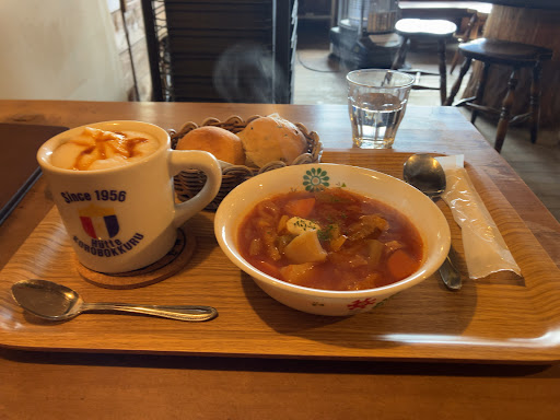 Read more霧ヶ峰に行くとリンちゃんがボルシチ食べたお店があると聞き調べる。 レビューによると色々と細かいこだわりのあるお店のようなので、事前に自分が注文したい金額でお釣りが出ないようにするだけでなく、念のために全てのお釣りが出ない組合せになるように1000円札5枚、500円玉1枚、100円玉5枚(山のトイレで出番が多いので多め)、50円玉1枚、10円玉5枚、1円玉10枚を財布に用意する。 水は蛇口でなく汲んでくるようなので、残さないよう薬分しか飲まないよう、最悪持参した湯冷ましを飲むようリハする。 席に着いてからメニューを見て決めるようだが、優柔不断で決めれないと嫌なので、レビューにアップされたメニューを頼りにボルシチの他に何頼もっか?フレンチトースト何にしよった?散々迷った挙句リンちゃんの頼んだボルシチセットにキャラメルミルクコーヒーで落ち着く。 前夜から下道で5時間かけ7時半に到着。 大周回コースを回ってから食べるか、食べてから回るか迷う。ここまで来てボルシチが食べれなかったらと不安になり先に食べると決める。 いつもなら30分前からとか平気で並ぶが、お店のレビューを見てビビって開店まで車で待機。 いざ開店5分前に並ぶ(誰も並んでいない)緊張して1秒が永い。ストレッチしてトレランに備える。自分の時計で秒読みで9時丁度ピッタシにお店の扉が待ち遠しく開く。マスター?さんが開けてくれ『お待たせしました。どうぞ』(緊張し過ぎてはっきり覚えていない)と言われ中へ。 レビューで店内を薦めている方がいたので暖炉の近くを。 予習はしてきたが、念のためメニューに目を通す。!なんとお値段が若干変わっている!こんなこともあろうかとエマージェンシーキットのお釣り全組合せセットの出番が! 本当はボルシチセットにフレンチトーストをセットできないか、メニューの組合せや注意事項を一生懸命受験の提出前の最終確認以上見て「ない、聞けない」と諦める。 あとお土産のマグカップの値段も投稿写真で確認してきているが店頭でも確認して(一緒でした) いざレジへ!マスター?へ2500円お釣りが出ないよう渡す。何も問題なし。 念のため買わなくて後悔しないかお土産全品チェック、外の席からもいいか景観チェック、外の貴重なお水を入れようととして呼ばれ、配膳をもらい、再度お水をもらいに、いっぱい飲もうか、三分の一くらいの少しだけ飲もうか迷った挙句薬で必要な半分くらいを頂く。 ついにボルシチへ!小生銀座の高そうなお店で大昔に頂いたきりですが、いつもならクレーマーな味覚なのに無理矢理でもないのに美味しい。疲れた登山者や山を愛している人が求めている味(主観的過ぎる?)近所ならすぐ来たい。 レビューで少ないと文句を書いているクレーマーがいましたが、自称クレーマーでも文句のないほど良い分量。 キャラメルミルクコーヒーに関しては多い、満足のいく量そして丁度いい味でした。 帰りも配膳を片付けようと持って行くと、待ち構えていてくださったのか、マスター?が近寄ってきて受け取ってくださり、皆さんからありがとうございますと言われ、マスター?から『お気をつけて』と言われ、今まで言われたことがないので、とて...