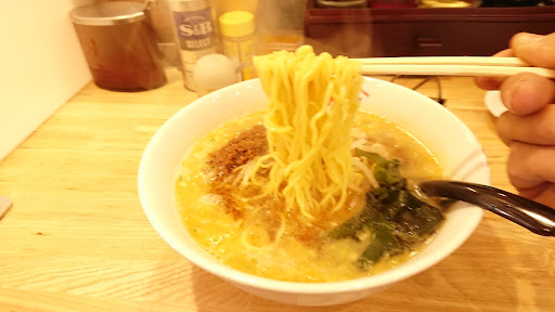 まずスープは。 白く濁って見えるのは表面だけで、中はあっさり醤油ラーメン。たぶんゴマペーストが浮いていると思われるが…。 いかんせん、ベースのスープがかなりあっさりで、ほとんど出汁感が無い。 ゴマペーストが無かったら風味も素っ気も無さそうだ。 たんたんめんとの事でひき肉がトッピングされているが、これも個性が無い。