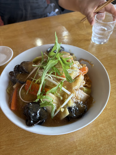 醤油ベースのスープに麻婆がかかる。 餡がスープに溶けて、麻婆の味も混ざって、なかなか美味いスープ💡