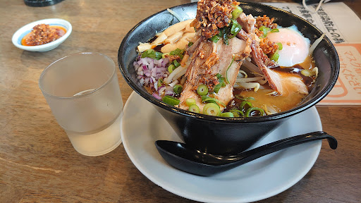 ●香り立つカレーの風味でコクのあるドロッと系の鰹出汁に魚介類ベースっぽいスープ ●もやしが敷かれ ●厚目にスライスされタワーの様に立てられ並ぶ自家製チャーシュー ●脇には半熟卵やメンマが添えられて ◎てっぺんには門蔵オリジナルの、食べるマー油 (こちら単品販売有りで瓶詰めでお勧めです ) これに、フライドガーリックを入れて戴きました。