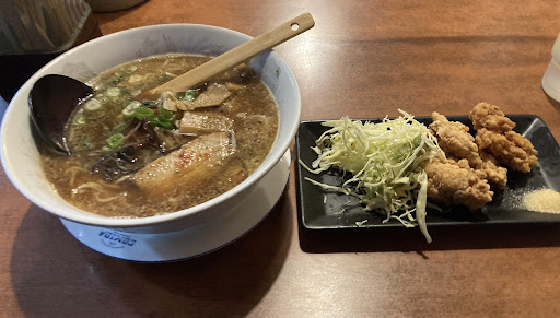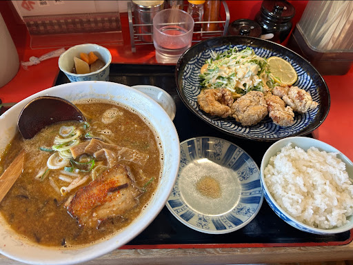 ランチタイムに入店。から揚げセットを味噌ラーメンで注文。税込1150円。 夫婦で切り盛りされている。 から揚げはカレー粉が効いたスパイシーな感じで美味しい。塩胡椒が付いてくるがマヨネーズも付けて欲しい。 ラーメンは味噌の風味とニンニクが効いて美味しい。もやしとキクラゲがトッピングされている。チャーシューは歯応えがあり旨味や香ばしいさがあって美味しい。麺は中太ストレート。 小鉢、漬け物付きもうれしい。 コロナ対策は努力を感じる。 愛想は普通。 店内はかなり年季が入っている。 しかし味、量、値段のバランスが良く又行きたい。