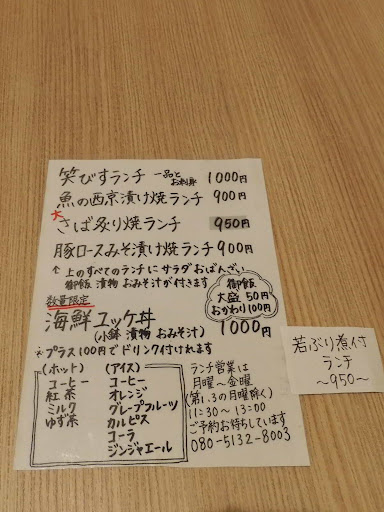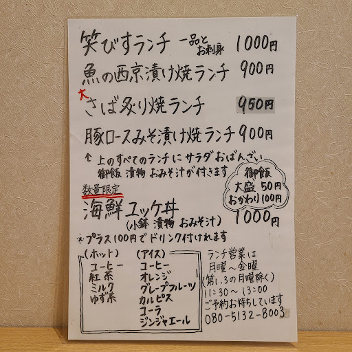 Read morelunchでお邪魔しました! 笑びす定食を頂きました。 刺身…臭みもなく新鮮美味しかった サーモンコロッケ…チーズ入りかな 横に添えてあるソースとの相性〇 副菜もお味噌汁も薄味で好み 上品な感じです。 1つ1つが、丁寧に作られている感じです。 ご飯の量は少なめなので 男性には足りないと思います。 ご飯のおかわりが1杯¥100円なので 頼もうと思えば頼めます。 コスパは少し高めかな。一つだけ思ったのは ご飯のお代わり・サービスで出来ると いいと思います。 腹7分目でした笑 量を求める方...