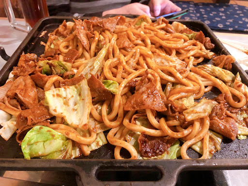 【ジャンジャン焼き】 まずうどんが2人前運ばれてきた後に、 大量のキャベツと豚肉が乗った鉄板が来ました。 火をつけた後はしばらく待機し、 ジュウジュウと音が出てきたら調理開始。 キャベツをめくると味噌ダレが顔を出すので、 豚肉を焼きながらタレを全体に絡め、 うどんを入れたらさらに麺にも絡めます。