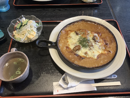 熱々に焼かれたカレーにチーズがたっぷり、とろーりとからみます。旨っ⭕ ほんと、やけど注意ですが、 ふーふーしながら、 美味しくいただきました。 サラダとスープがセット。