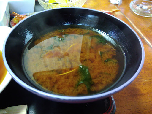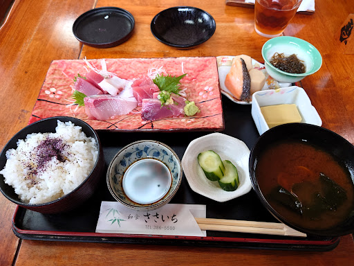 場所は国道23号線の磯山二のファミリーマート磯山駅前店と鈴鹿磯山郵便局の間を海側に曲がって踏み切り超えて少し行くと右手にお店があります。昭和感漂うお店で、明るいおばさんに出迎えられよく冷えたお茶とメニューを提供してもらい、お造り定食を注文しました。暫く待つとお造り定食が配膳されました。いい感じのラインナップです。ゆかりが振りかけられたご飯にお造り、もずく、ごま豆腐、漬け物、鮭、里芋と定食ではあまりないあさりの味噌汁がついているのがいいですね。ホームページのお品書きの値段は古い明記でした。今度は日替わり...
