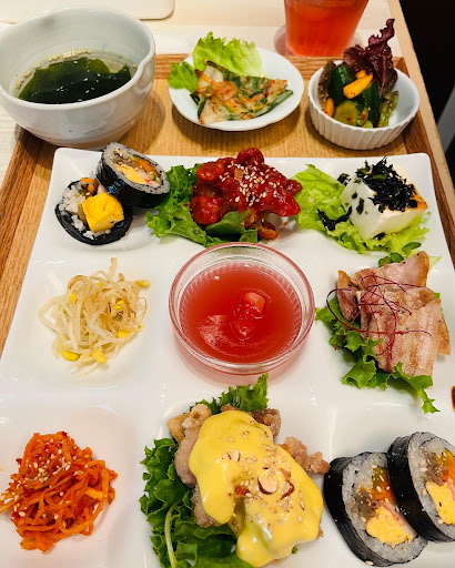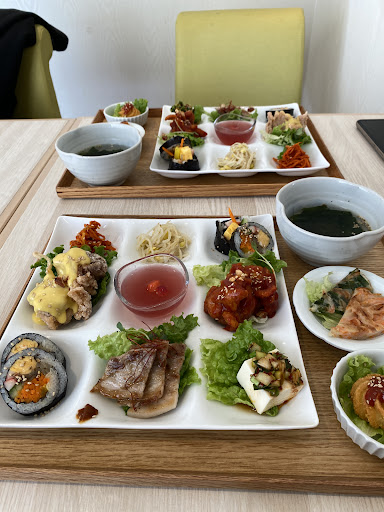 友達は ✿チョアヨ!ランチ2300円で9つに仕切られてるプレートに2箇所キンパ(計4つ)真ん中にデザート、残り6箇所におかず。 ワンプレートランチの小皿と同じのにサムギョプサルとヤンニョムチキンが盛られ、別の小皿にチヂミ2枚とオイキムチ、ワカメスープでした🍚