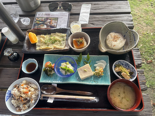 Read moreAbsolutely delicious. Six or seven different tofu dishes, including a tofu pudding dessert. This is real tofu. The flavor of the tofu is the star here. Everything is hand made, fresh, and beautiful. The view is fantastic, too. The lunch course was about ¥2000 and when we ordered coffee after the meal, the kind owner gave us cookies and mikan. Highly...