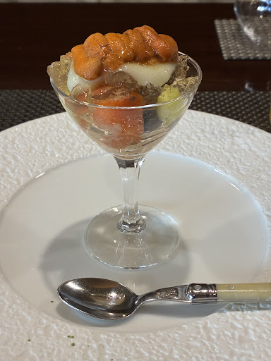 中でも印象的だったのが、ウニを使った冷たい前菜。見た目の美しさに心を奪われ、一口食べれば、その繊細さと深い味わいに言葉を失います。ウニ、サーモン、ニシ貝、ジュレ…すべてが完璧に調和し、ただの料理ではなく「作品」と呼びたくなる一皿でした。