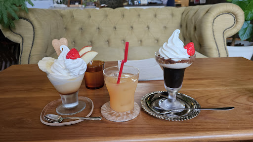 落ち着くカフェです! 店員さんも笑顔で、接客が良かったです😊 コーヒーゼリーが結構苦めですが、上に乗ったソフトクリームが甘くて美味しく、苦いのが苦手な私でも美味しく楽しめました🥰ソフトクリームの周りにあるコーヒーのシャリシャリしたシャーベット?も、ソフトクリームと食感が違って面白かったです! プリンパフェにはソフトクリームと生クリーム、ザクザクのウエハースと甘酸っぱいイチゴ、シャキシャキのりんごが乗ってました!🍓🍎🍮 プリンは固めの卵感が強いものでした!昔ながらのプリンという感じで美味しかったです😋 グレープフルーツジュースがあるカフェって結構少なくて、貴重でした!勿論フレッシュで美味しい♡